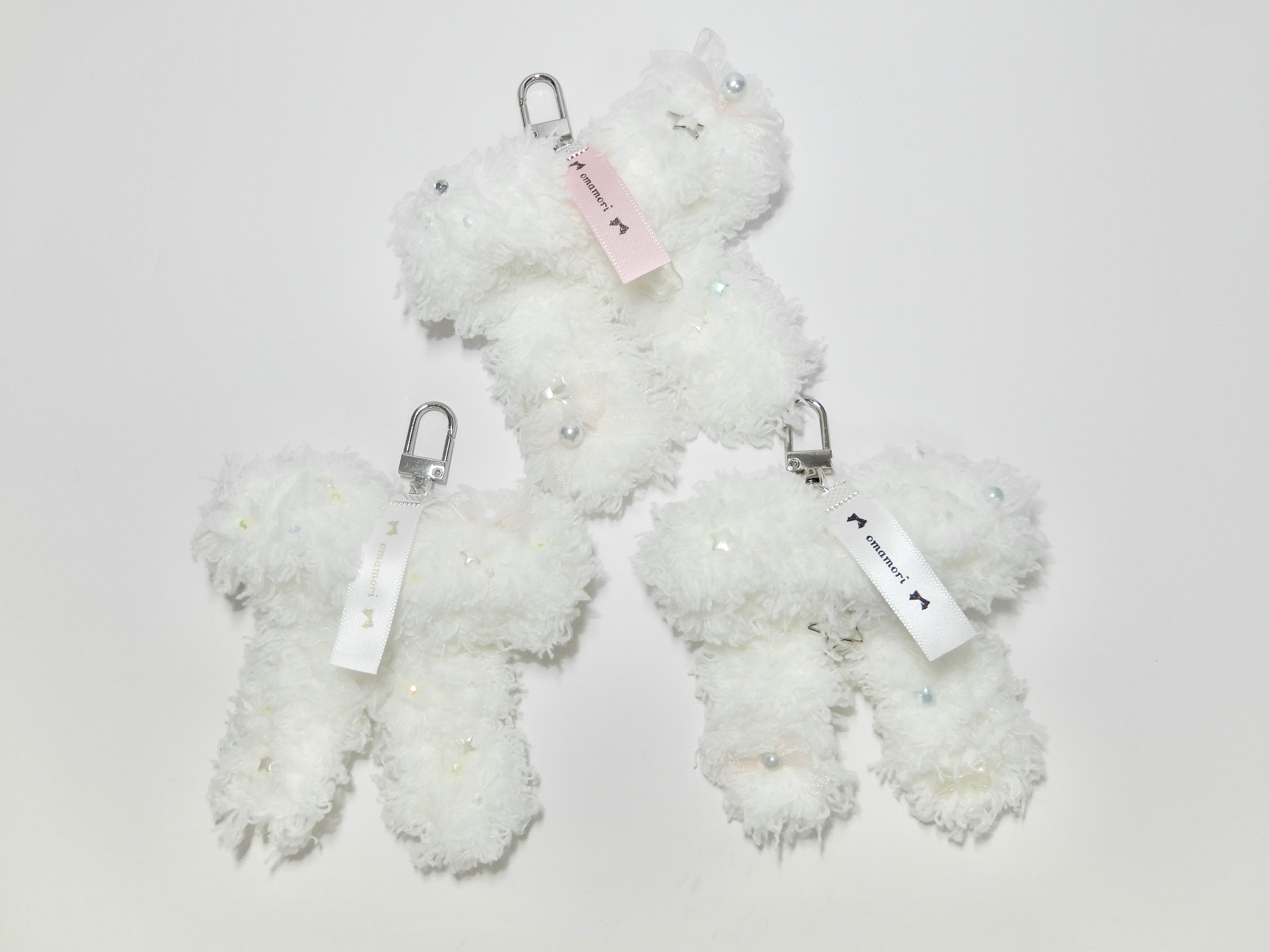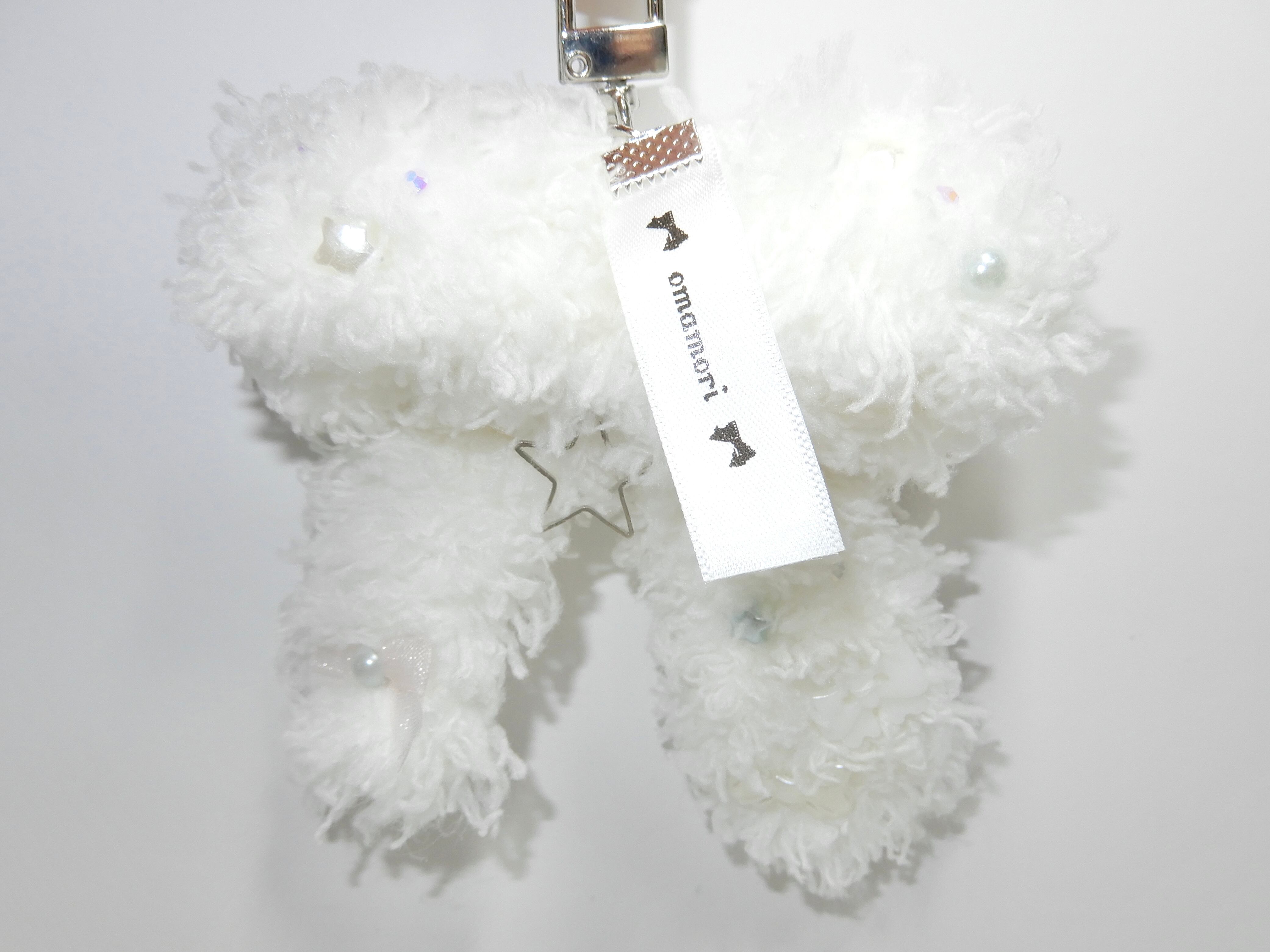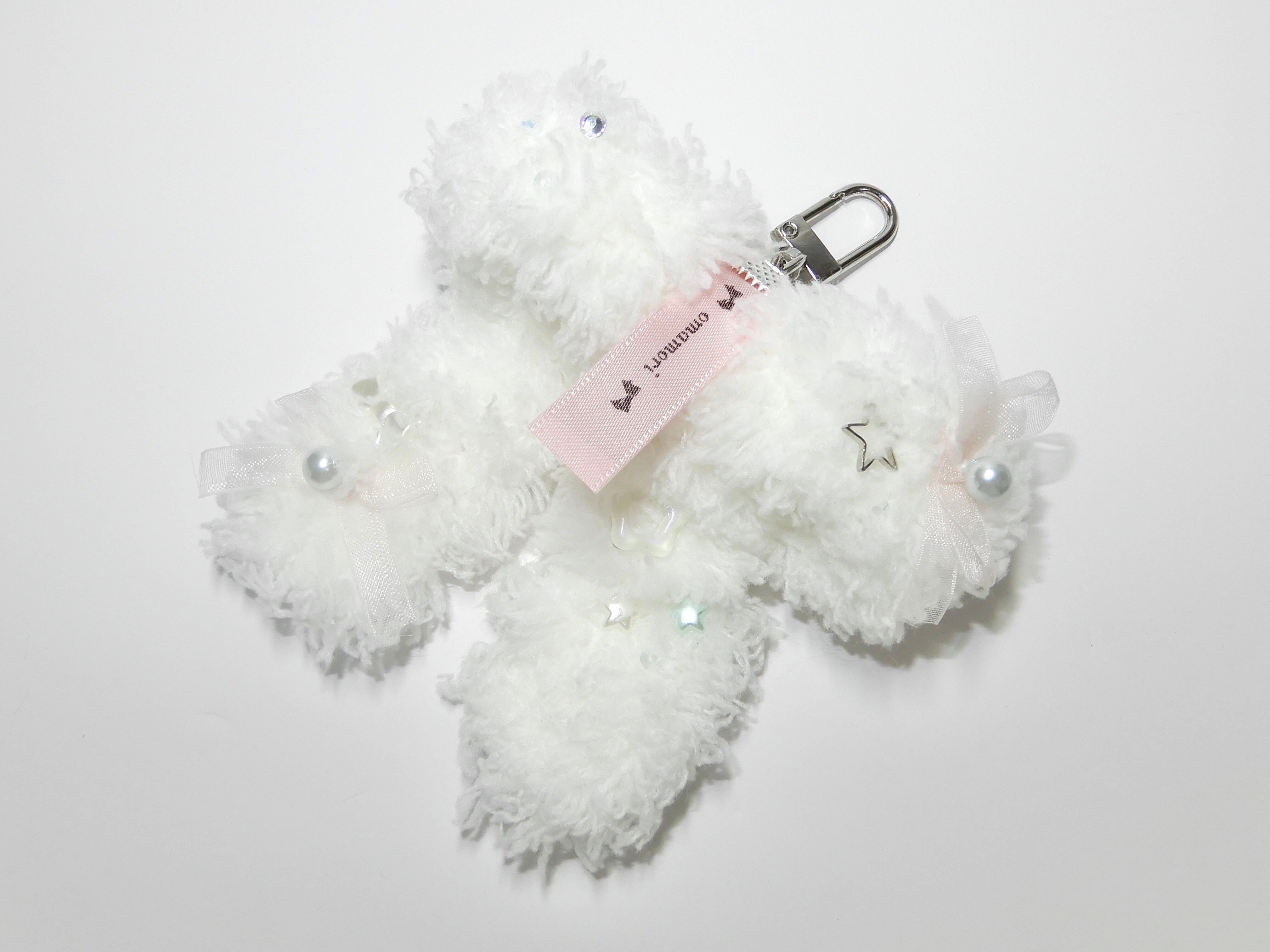 ホワイトのもこもこ毛糸で仕立てた手編みのキーホルダー。