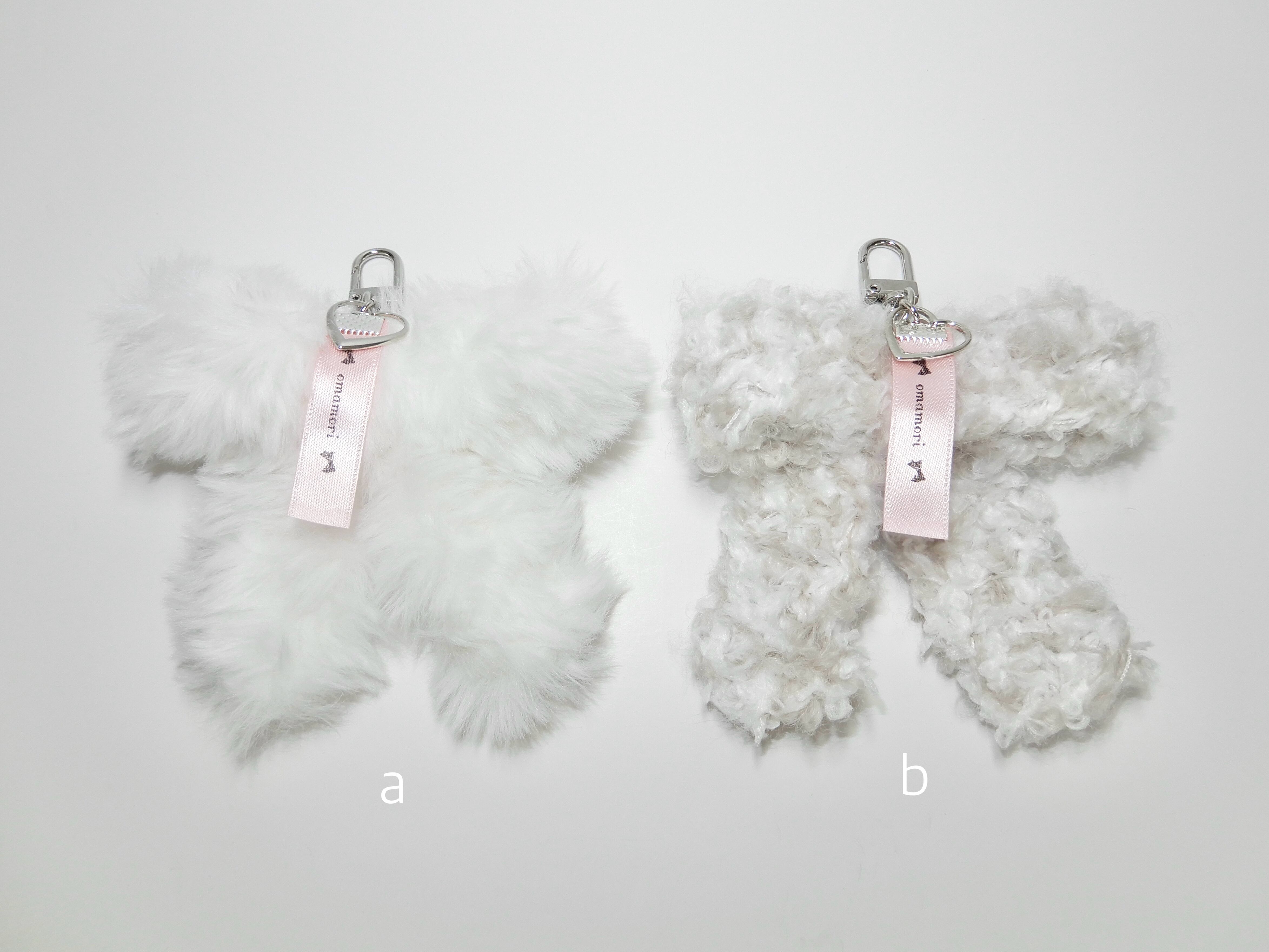 ホワイトのファーヤーン&ホワイトブラウン・淡いピンクのファンシーヤーン・ホワイトのもこもこ毛糸で仕立てた手編みのキーホルダー。