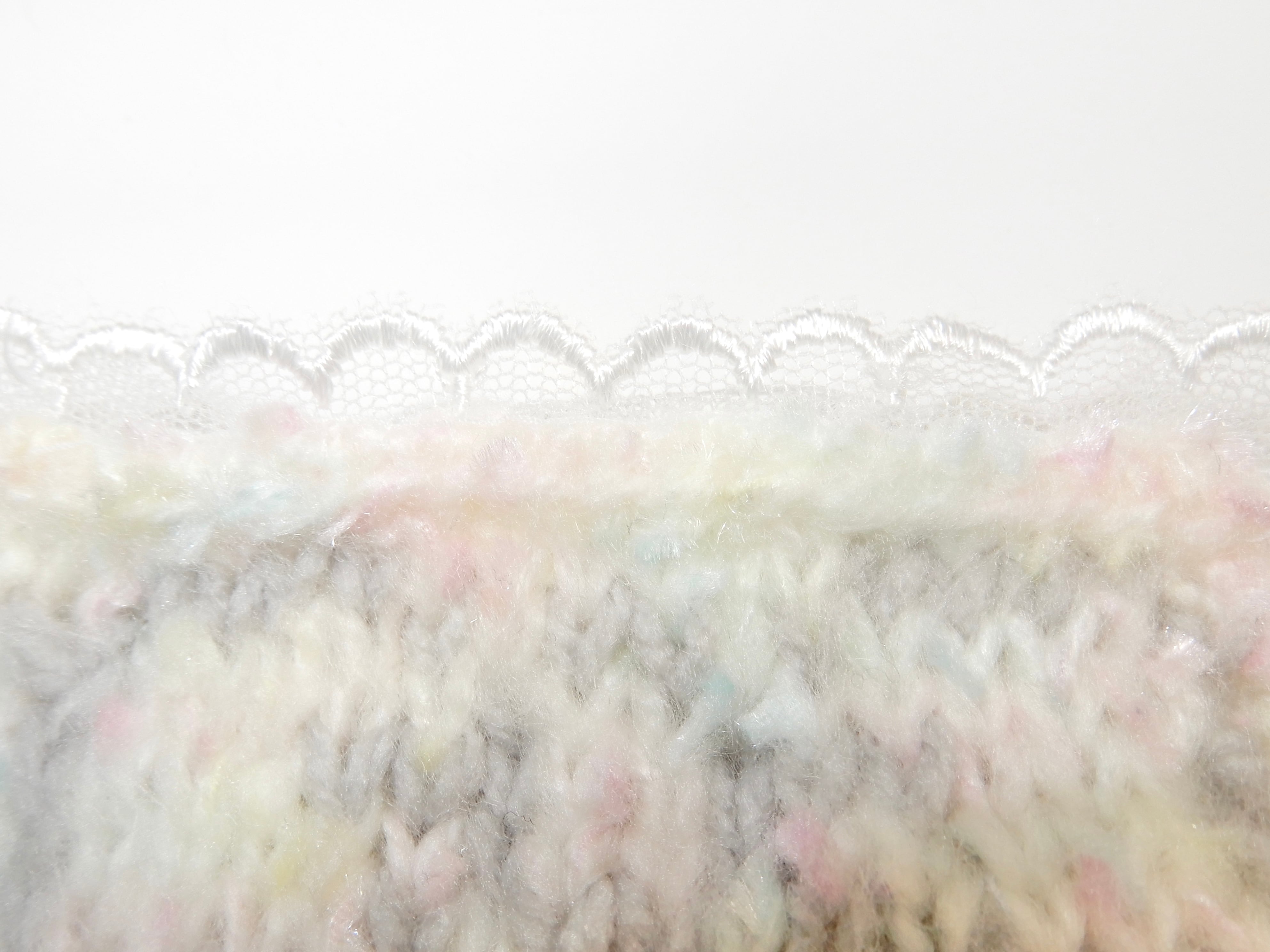 カラフルフラッグが入ったふわふわの毛糸に淡いグレーの毛糸でリボン柄を ྀི