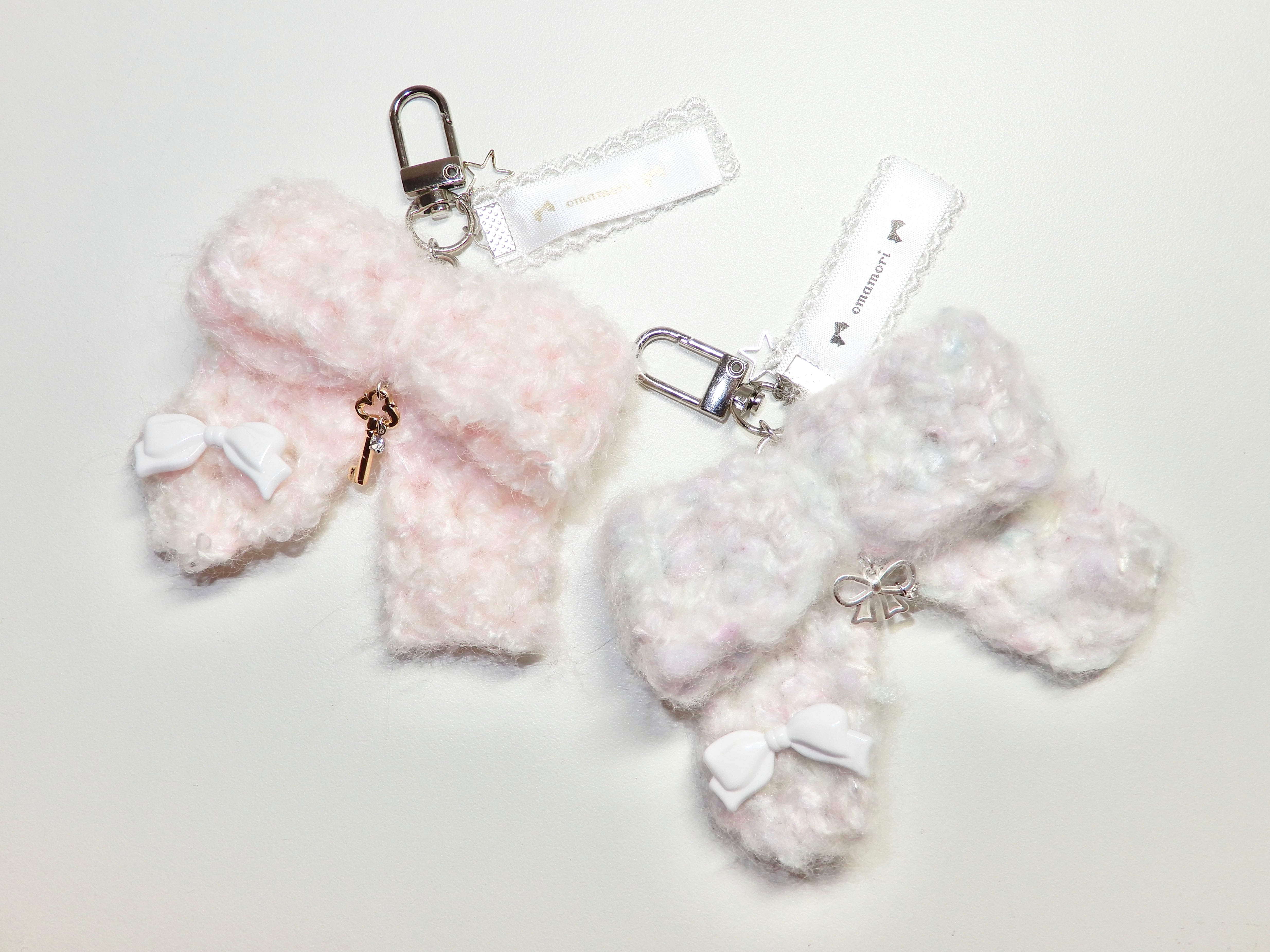 オフホワイトのモヘヤ調毛糸・ループヤーン・ホワイトピンクのモヘヤ毛糸を紡いで編んだホワイトピンクのリボンチャーム꙳