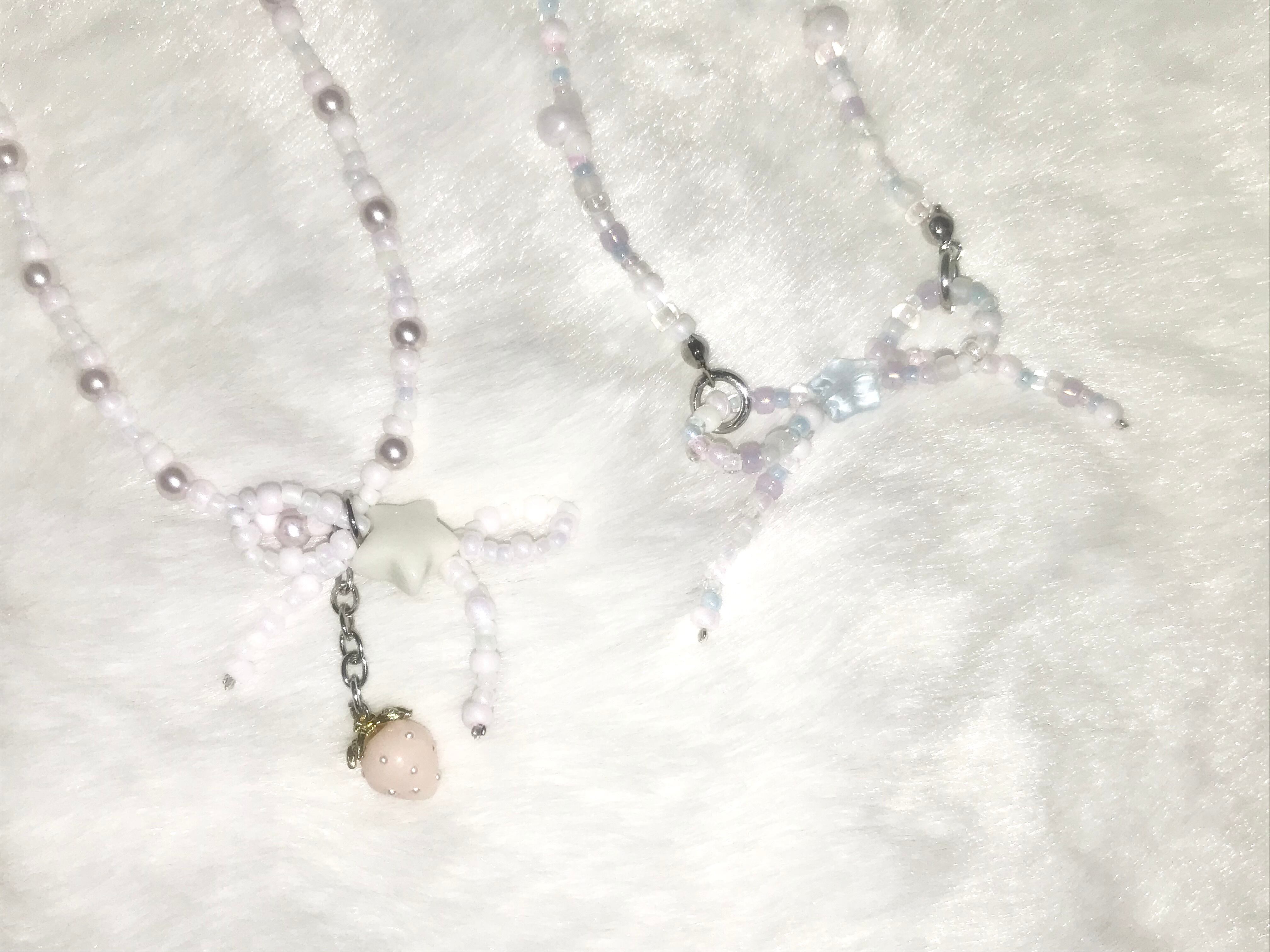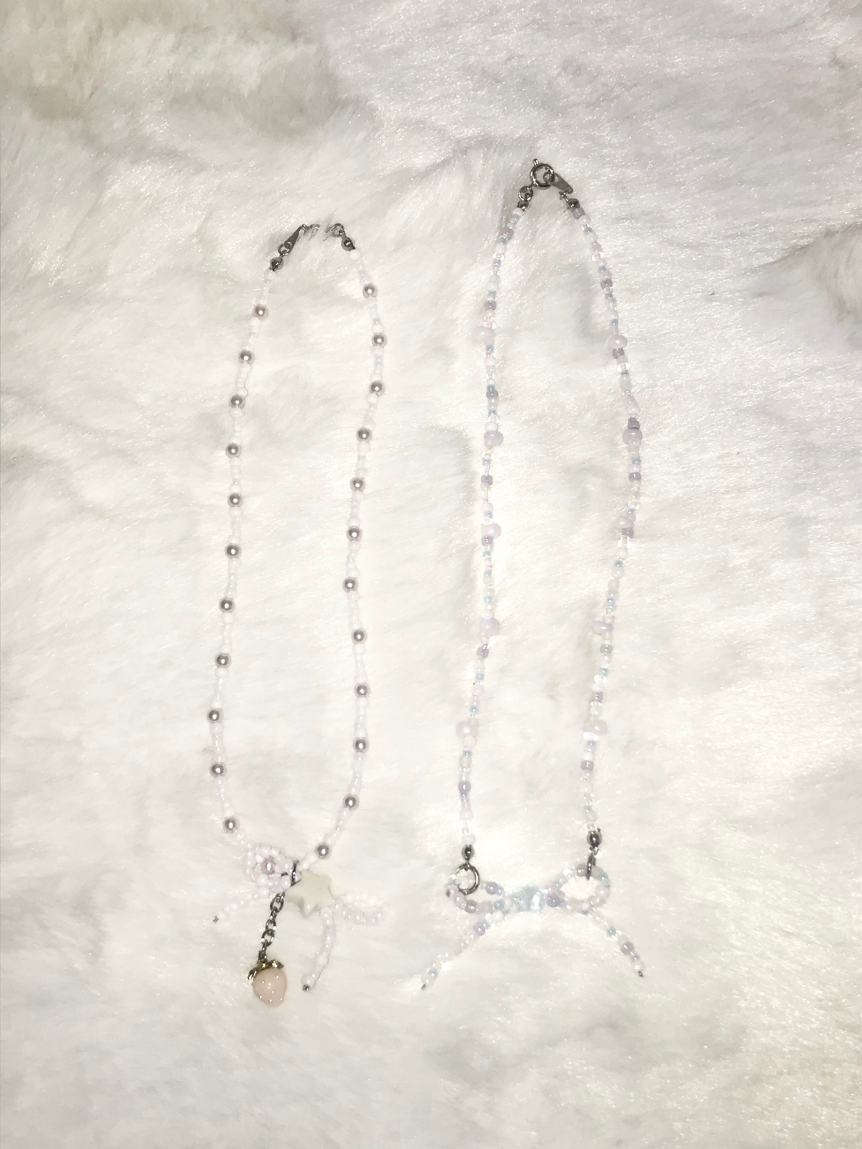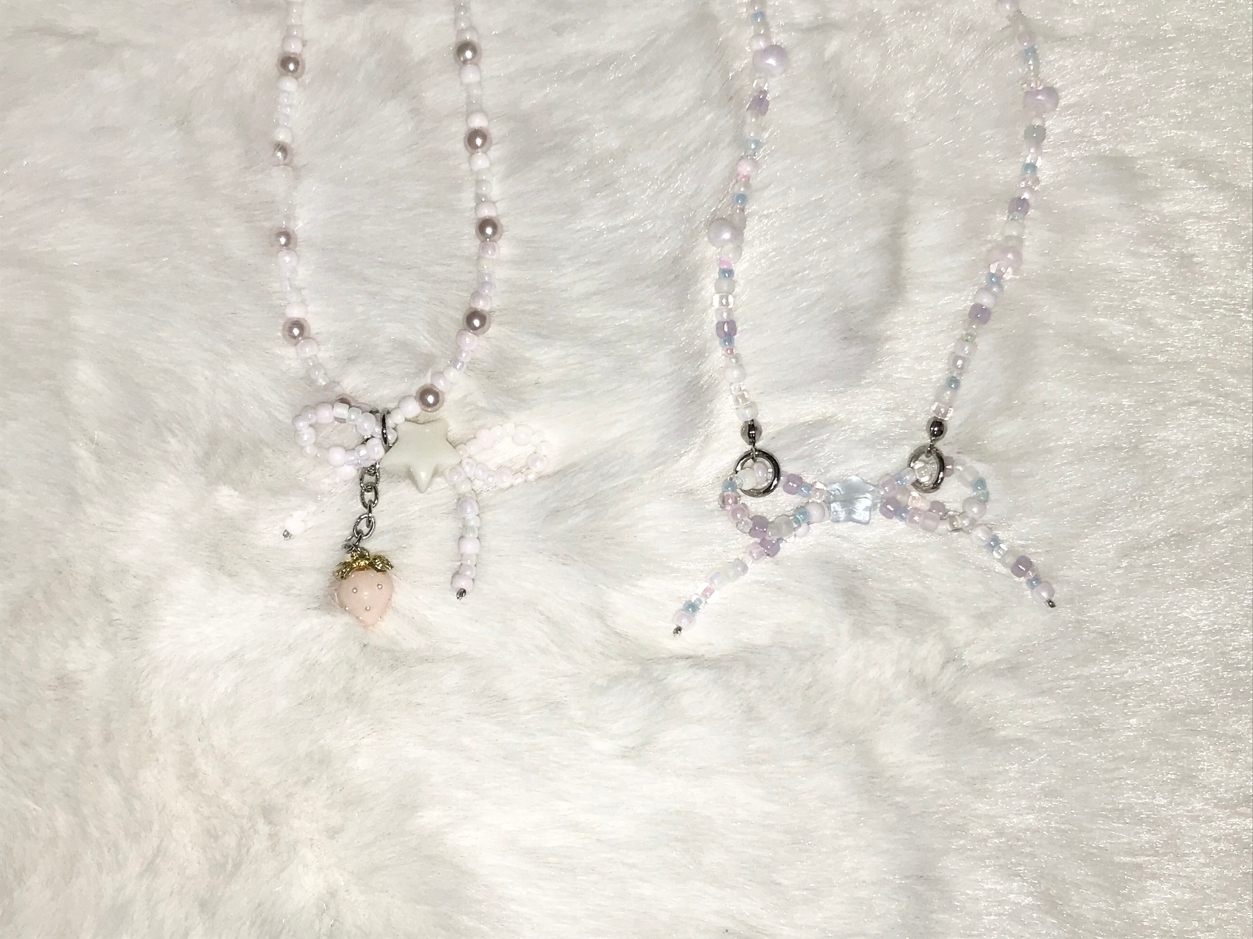 水色、パープル・ピンク・ホワイト・ミントグリーンなどのパステルカラーのビーズ、乳白色のビーズやしずく型のビーズでお作りしています꙳ ꙳