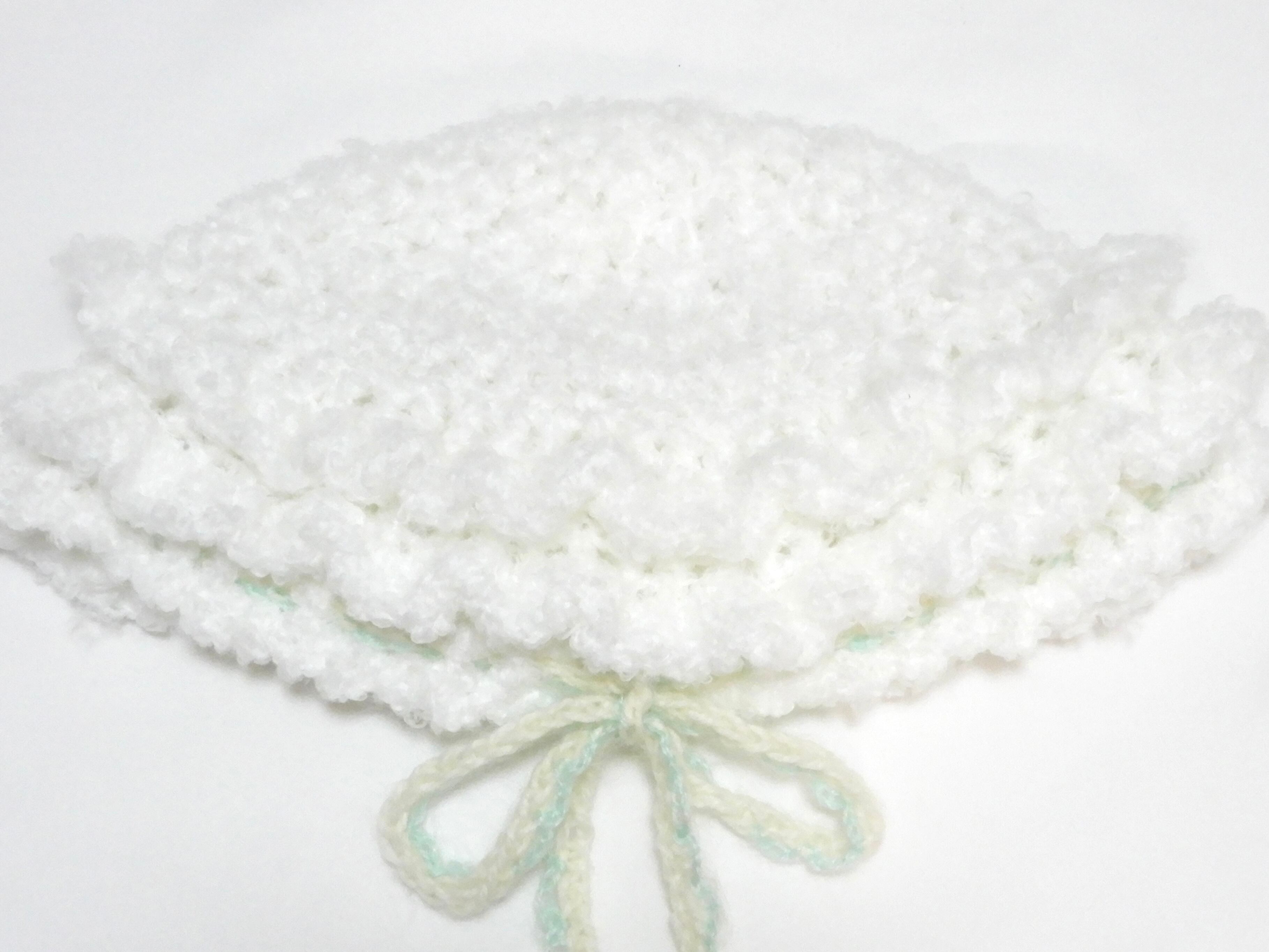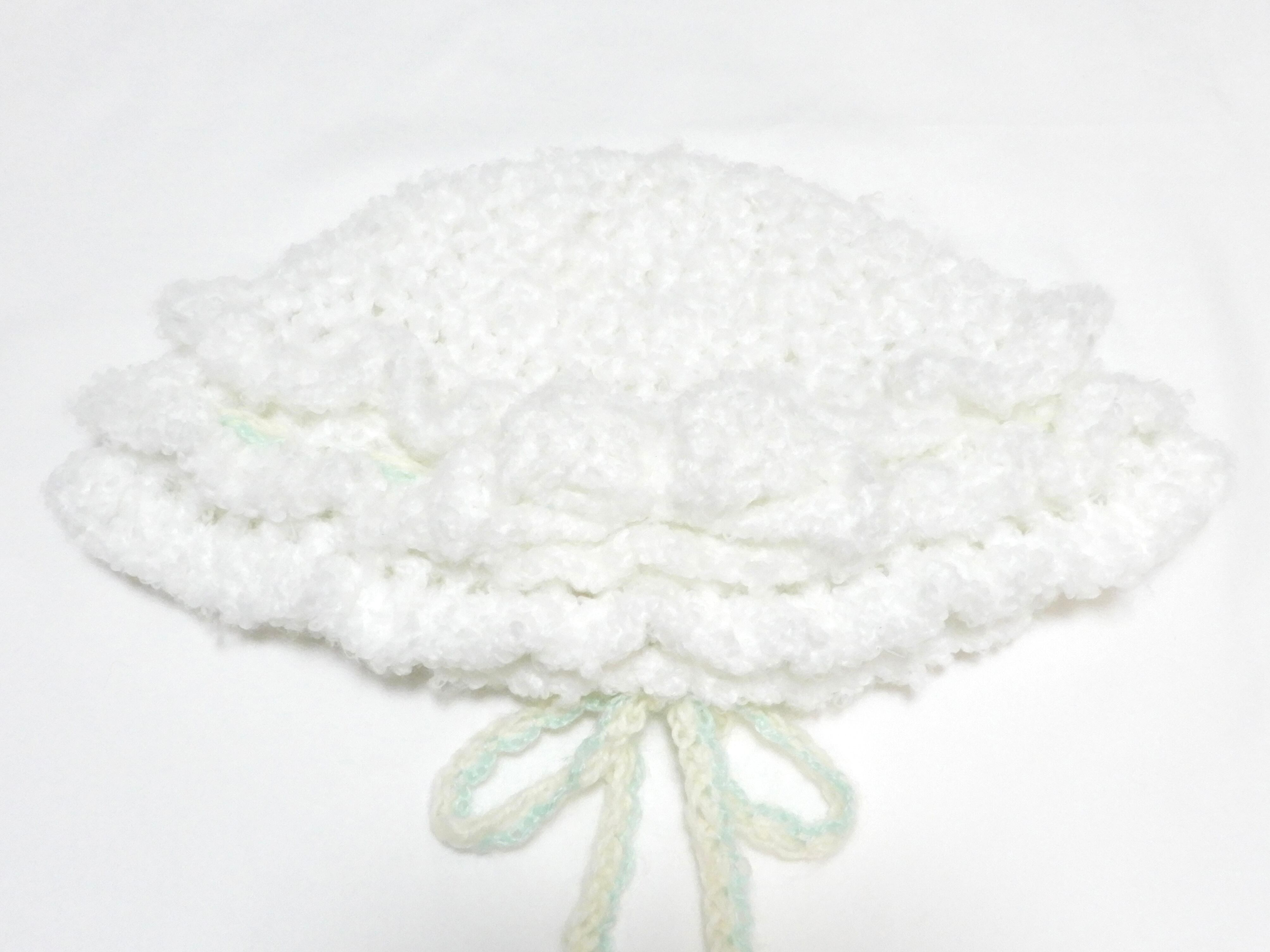 ホワイトのぷくぷくとしたファンシーヤーンで仕立てた手編みの帽子。