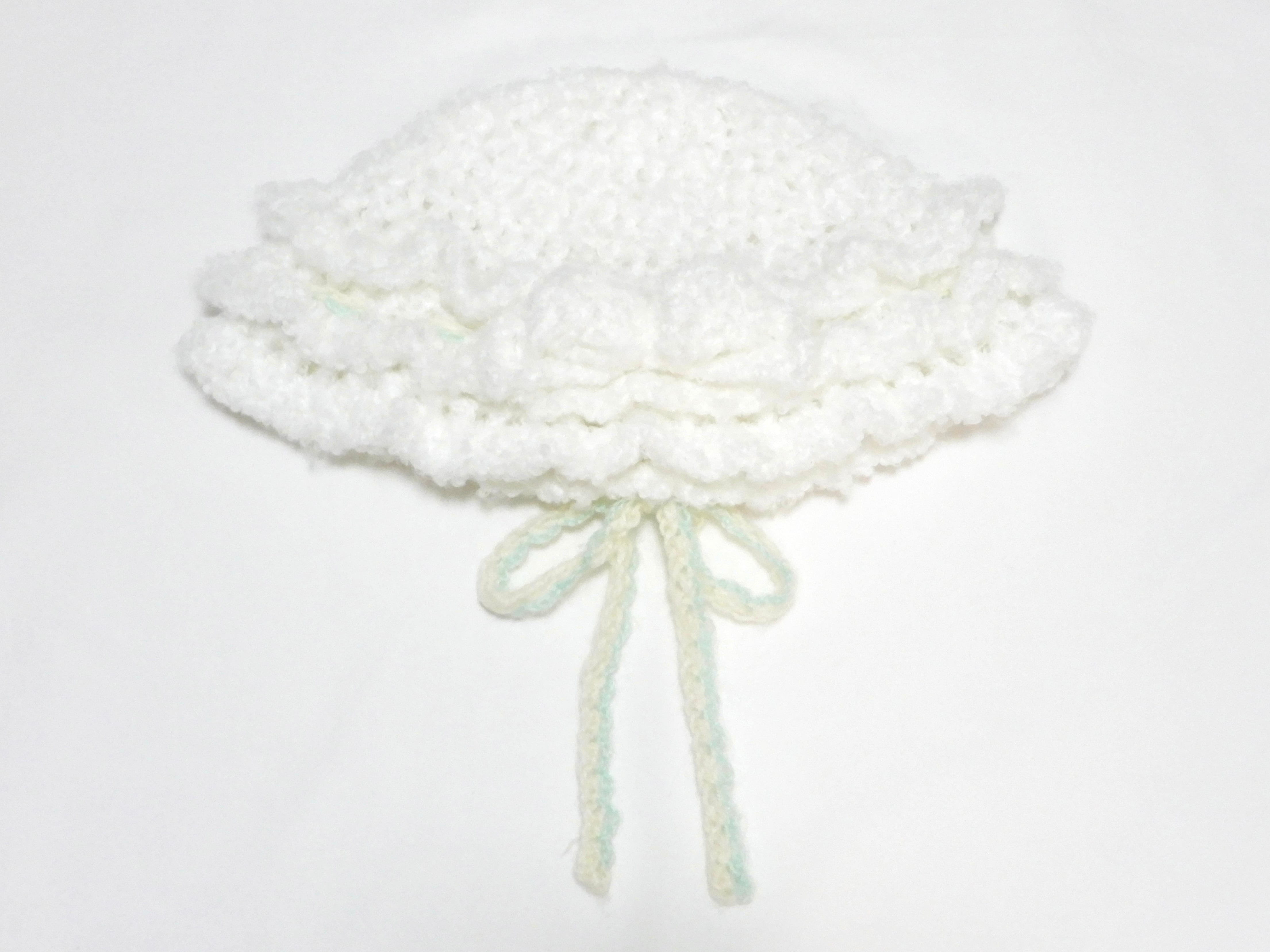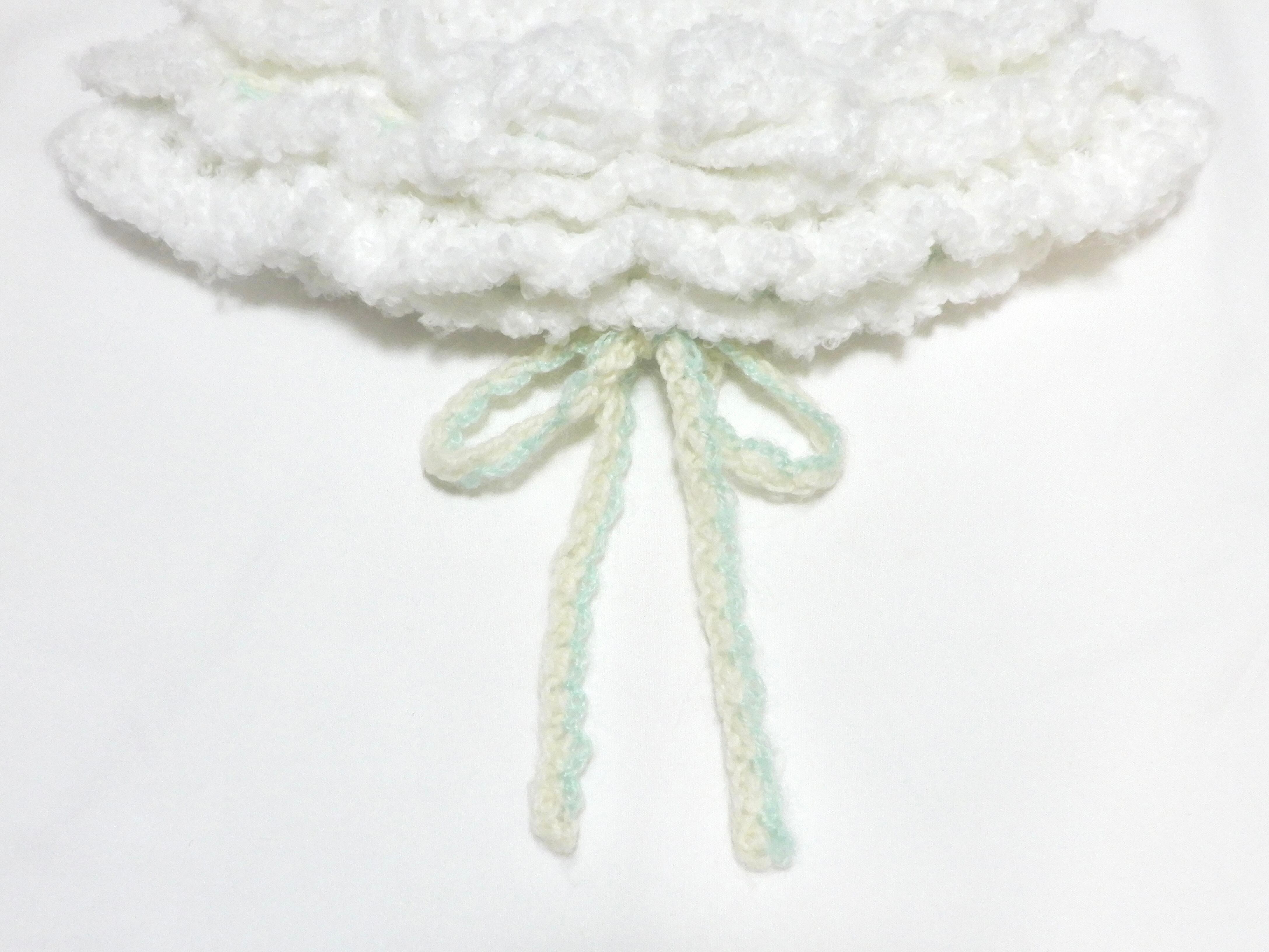 frontの大きなりぼん、3段フリル、backのミントグリーンのもヘアの毛糸とオフホワイトの起毛毛糸で編んだりぼんが ぬいぐるみ ྀིのようなデザイン♩♩