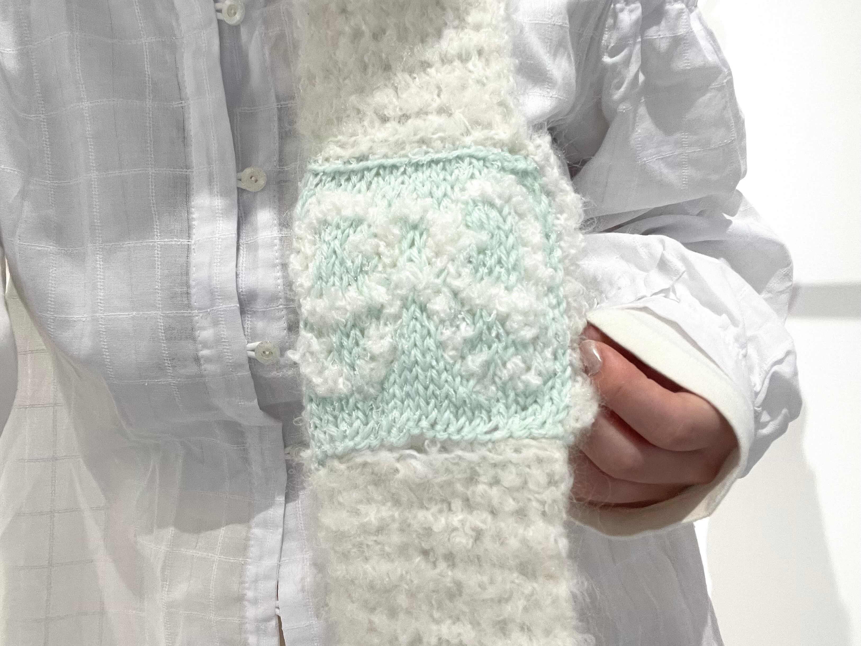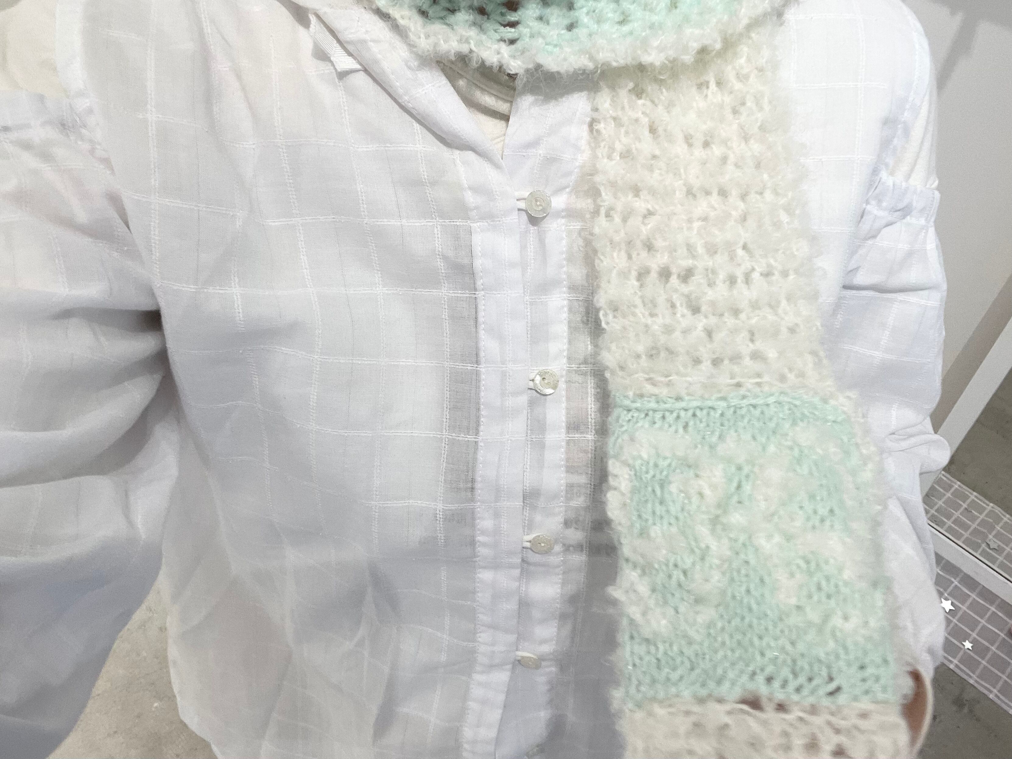オフホワイトのループヤーン、もこもの毛糸、ミントグリーンの毛糸、ミントグリーンのモヘア毛糸、きらきらと光るループヤーンで仕立てたマフラー。