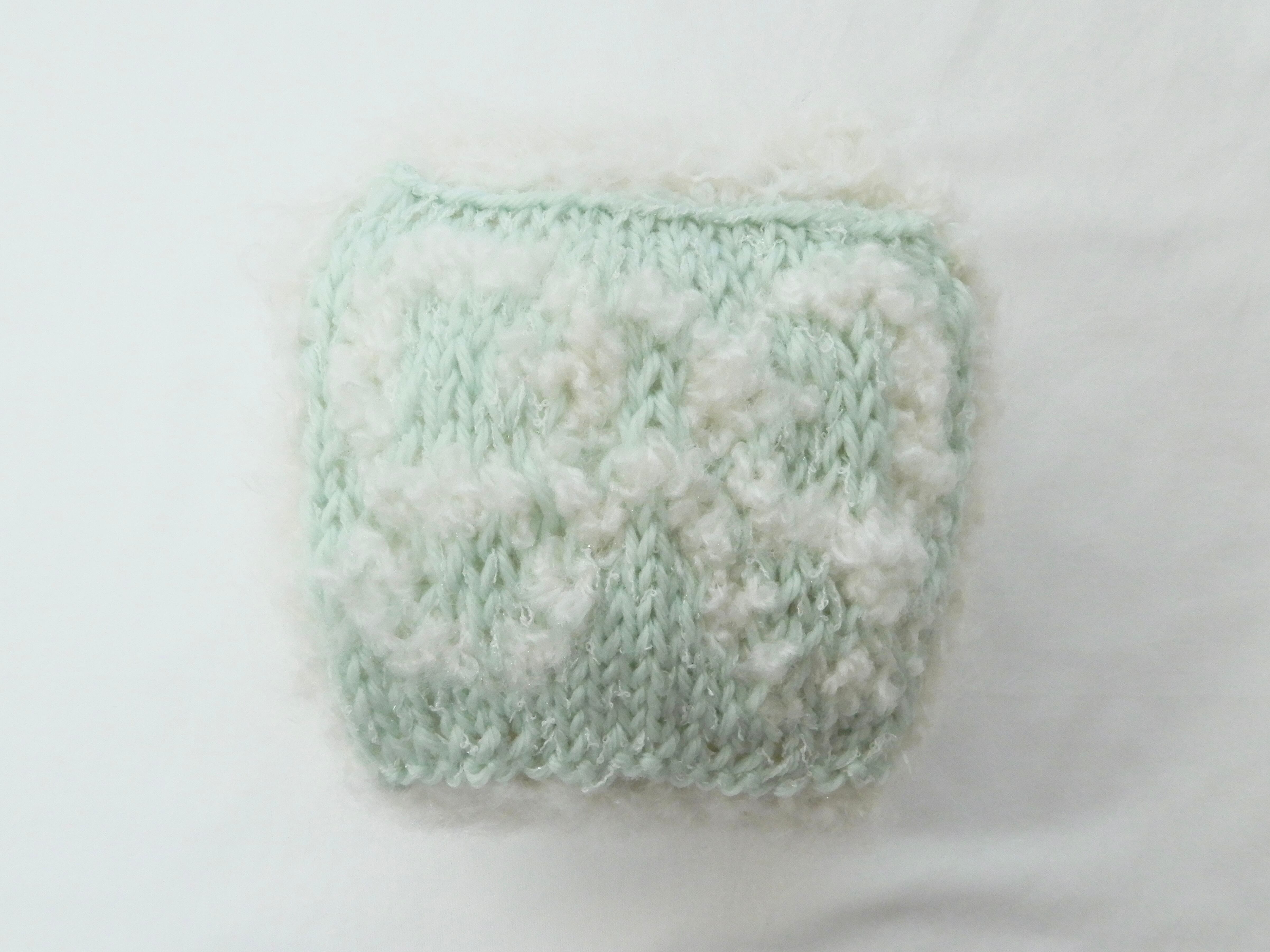 ミントグリーンのモヘア毛糸、きらきらと光るループヤーンを土台にもこもこ毛糸でガーリーな りぼん⪩⪨ の柄編みを編み合わせたデザイン໒꒱