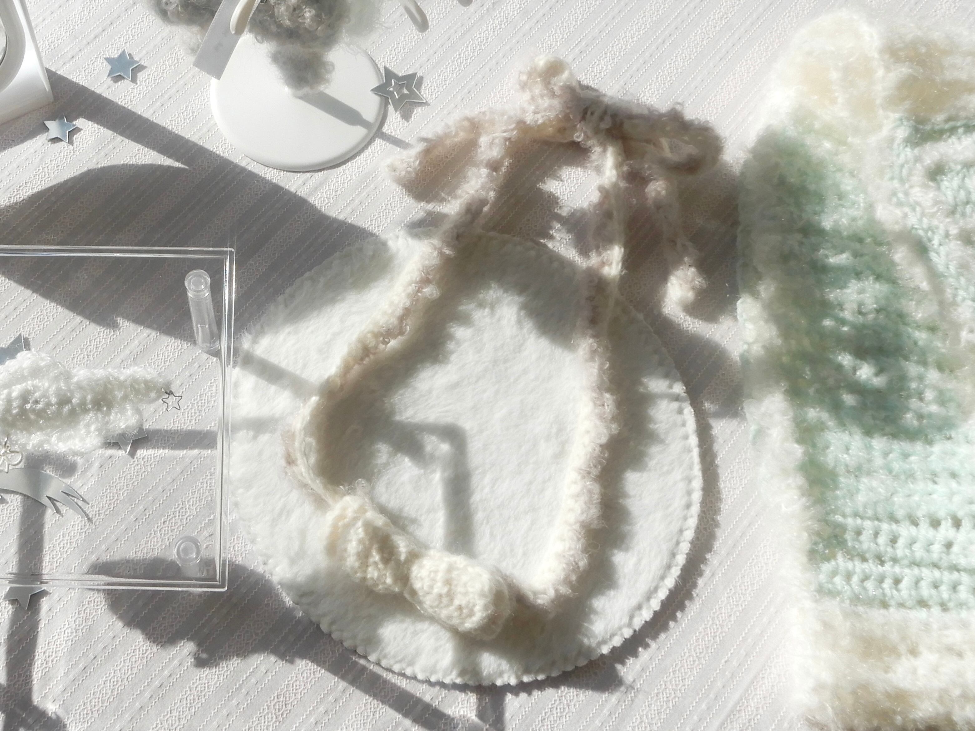 少し大きめ手編みのふんわり柔らかいりぼんと、紐部分のオフホワイトこ起毛の毛糸の周りのホワイトブラウンのループヤーンのフリルの縁どりがガーリーなアイテムᡣ੭